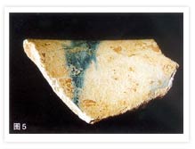 唐鈷藍(lán)點(diǎn)彩碗口沿殘片(圖5)。尺寸為5厘米×3厘米。白胎。釉下鈷藍(lán)點(diǎn)彩,鈷藍(lán)成色翠藍(lán),暈散。