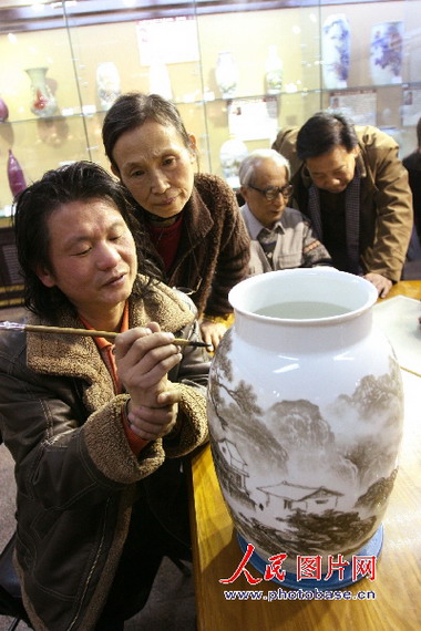 12月6日,來自江西景德鎮(zhèn)高級工藝美術(shù)師劉敏現(xiàn)場進(jìn)行瓷繪表演。 版權(quán)作品,請勿轉(zhuǎn)載。
