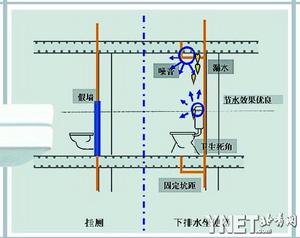 漏水、噪音、衛(wèi)生死角成為最讓人頭疼的衛(wèi)生間三大惡疾,上海吉博力房屋衛(wèi)生設(shè)備工程技術(shù)有限公司北京辦事處經(jīng)理陸紅巖女士告訴記者,衛(wèi)生間的這些問題與傳統(tǒng)住宅的排水方式密切相關(guān),一般而言,樓上的馬桶、地漏排水管道都會穿過本層樓板,在樓下頂板處打個彎兒,再走進(jìn)排水管中,這樣,水流的聲音順著管子傳下來,同時,因為層層樓板穿洞而發(fā)生的漏水現(xiàn)象也屢見不鮮。而且由于建房預(yù)留的管道位置普遍適用于落地式馬桶等潔具,因此在這些潔具與墻體、地面接觸的地方,都會不可避免地留下難以清理的衛(wèi)生死角。當(dāng)然,固定坑距也對衛(wèi)生間的空間布局造成了限制。