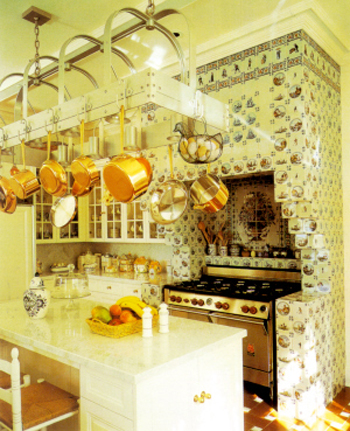 這座凹凸壁爐的表面從上至下鑲滿(mǎn)了陶制貼面磚,大體是參照十七世紀(jì)荷蘭家居的風(fēng)格排列的,各種各樣的圖案構(gòu)成了引人注目的組合,在金屬感覺(jué)盛行的廚房中顯得別具一格