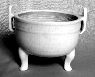 元樞府瓷香爐,高8.8厘米,直徑11厘米,爐內(nèi)深4厘米,露胎不施釉,有輪制痕跡,一圈一圈,十分清晰,略帶點桔紅色。胎體輕薄,造型精巧,貼一對精致的長條豎耳,腹上部刻有兩圈凹弦紋,弧形收腹,平底,爐的底心不施釉,還有紫紅色墊燒的印痕,留有手工刮坯的痕跡。通體施乳白釉,色澤近似鵝蛋白,肥腴敦厚,滋潤均勻,釉面自然開片,發(fā)現(xiàn)多處縮釉點,同影青瓷不同,沒有透明的感覺,大方自然。下安三只獸蹄形足,足底也施釉,這比較少見,器型平穩(wěn)規(guī)整。