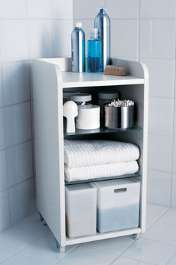 帶滾輪的低矮浴室柜,可以裝上各種洗浴用品和換洗衣服方便地推到浴缸前。