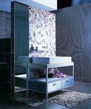 如果你的墻面底色較深就運用博洛尼最大膽的POP花色瓷磚作為主題墻裝飾墻面吧。讓報紙堆砌出的亮麗色彩大面積裝飾,拼貼的效果會使浴室設(shè)計看起來更加大氣,配上熠熠生輝拉絲鋁浴室家具和亮面鏡子絕對拉風。張揚的創(chuàng)意是時尚年輕人不二的選擇。