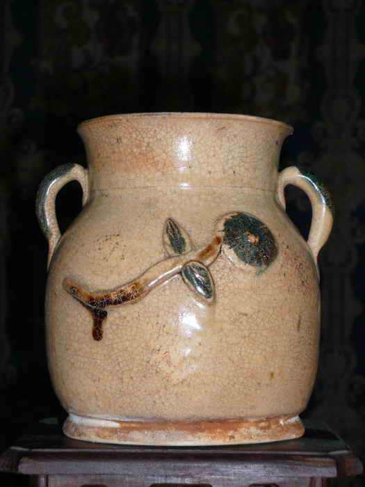 地處安徽省西南、長(zhǎng)江中下游北岸的安慶地區(qū),墓葬中時(shí)有長(zhǎng)沙窯器物出土,品種有壺、罐、碗、玩具等等。這是懷寧縣一唐代墓葬中出土的一件長(zhǎng)沙窯褐綠彩雙系罐。此雙系罐高18.5厘米,口徑15厘米,腹徑17.5厘米,直頸,口沿外侈,窄肩,直腹,底部?jī)?nèi)凹,肩貼雙系,雙系兩面用褐綠彩點(diǎn)繪相似的斜方形狀圖案紋飾,斜方紋內(nèi)用綠彩點(diǎn)繪波浪紋。整件器物形體大方,修胎規(guī)整,釉層瑩潤(rùn)光滑;為襯托出彩料的成色,達(dá)到其彩繪美的效果,器物胎上涂有一層化妝土,起到了增強(qiáng)胎體的致密度和增加瓷胎白度的作用;同時(shí)紋飾采用點(diǎn)、線表現(xiàn)手法,水墨暈散效果的抽象圖紋,給人以豐富的想像空間。是一件難得的唐代長(zhǎng)沙窯珍品,2004年安徽省文物鑒定站鑒定為國(guó)家二級(jí)文物,現(xiàn)收藏于懷寧縣文物管理所。