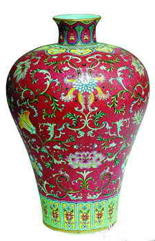 梅瓶誕生于北宋時(shí)期,因口徑之小僅能插梅枝而得名。本文介紹的這件清乾隆紫地軋道粉彩勾蓮紋梅瓶,以其典雅、秀美的造型,體態(tài)曲線,深受世人喜愛。該梅瓶形軀飽滿,豐艷的粉彩釉色及完美的手工讓此器成為存世乾隆官窯瓷器中最令收藏家夢寐以求的珍品之一。這件清乾隆紫地軋道粉彩勾蓮紋梅瓶的制造過程十分繁復(fù),燒好瓶胎后,工匠繼而用一種狀如繡針的金屬工具在彩色釉地上撥畫出一種細(xì)如毫芒的鳳尾紋,俗稱“軋道”工藝,再以粉彩料加繪出勾蓮紋花卉圖案,被稱為“錦上添花”。