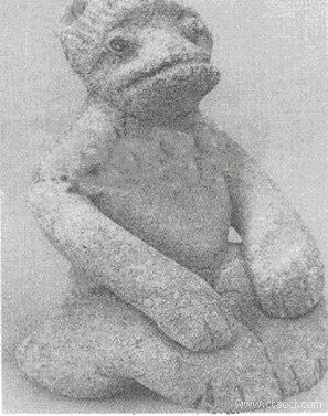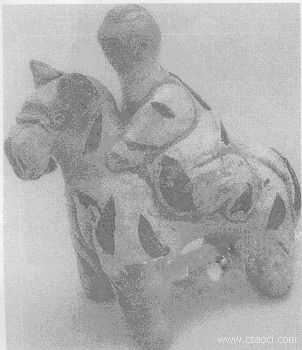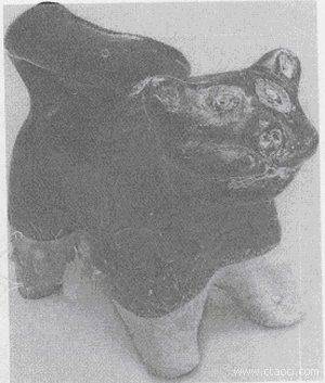 3.畫風(fēng)畫法。吉州窯古陶瓷裝飾,無論是剪紙還是彩繪,講究簡練的畫風(fēng)畫法和疏朗有致的圖案布局,往往寥寥數(shù)筆勾勒成形,或點(diǎn)綴幾筆以打破平面,極其寫意又十分傳神(圖3),絕無文人騷客筆下的山水人物、花鳥蟲魚,即使同畫梅花也別具一格。其圖案均源于自然,取自民俗生活,多以自然物為對象,如菱花(圖4)、團(tuán)花、梅花、梅枝、蕉葉、奔鹿(圖5)、彩蝶、波濤、貓、狗、虎(圖6)、馬(圖7)、蟲、魚,常見“金玉滿堂”(圖8)、“長命富貴"、“龜鶴齊壽”、“兒孫滿堂”、“多子多福”、“金桂玉蘭”等吉祥語剪紙,還有馬上猴(寓立刻封侯意)、凳上猴(圖9)等彩繪泥塑瓷。這些裝飾圖案質(zhì)樸明快、童趣盎然,民俗理語特點(diǎn)鮮明,濃烈的生活氣息撲面而來。