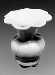 這是一件南宋湖田窯的花瓶,它高15厘米,口寬約9厘米?纹靠谌绶剖嬲,瓶頸與瓜楞形瓶肚接得妥帖,恰如其分,整個(gè)瓶體大氣,花瓶的釉面雖更顯牙白,但像涂了一層油脂似的滋潤,放在手中摩挲把玩,有一種手執(zhí)美玉賞心悅目之感。