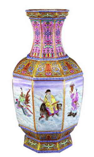 乾隆朝是古代最為繁榮富庶的朝代,當時的工藝品極盡工巧,裝飾風格追求全滿,具有“無物不吉利,無語不吉祥”的特點。嘉德2006春拍,一件乾隆粉彩開光八仙過海圖盤口瓶以5280萬人民幣成交。此器為乾隆官窯器,瓶身裝飾圖案富麗華貴,構圖繁密,瓶頸部繪粉彩盤結(jié)、磬、纓絡紋寓意“福壽吉慶”,瓶腹八面開光內(nèi)繪“八仙過海”圖,這些顯然都是為了取悅乾隆皇帝而精心構思的。既是皇帝御用瓷器又有非常吉祥的圖案裝飾,這都決定了它的不菲身價。