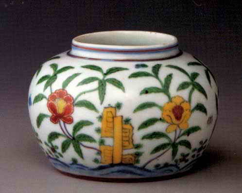 明代“斗彩瓷器”以成化年間最多、最著名。其胎釉精細、造型玲瓏、風格輕盈。成化“斗彩折枝花蝶紋罐”:直口圓唇,直筒形短頸,豐肩,寬腹;腹以下漸收,平底,淺足;胎釉細膩潔白明凈。