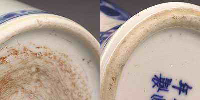另外釉質(zhì)也有一定的不同?滴醮善鞫啾砻嫫秸饣再|(zhì)較厚,半透明、呈淡青色。也有一種表面有小點(diǎn),釉質(zhì)較薄、呈渾濁的白色,常有爆釉現(xiàn)象,與光緒瓷器極為接近。光緒釉質(zhì)較薄,表面不平整,常有瑕疵。