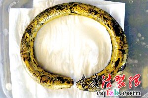 描述:數(shù)量為一對,質(zhì)地為鎏金龍紋金手鐲,出水后仍顯黃金本色,只有手鐲的兩頭接口處部分呈氧化后的黑色。該手鐲重達4兩,直徑約11厘米,龍形花紋有中國傳統(tǒng)特色。