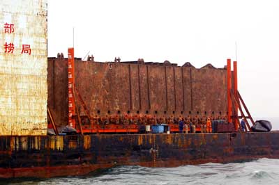 昨天,廣州打撈局的工作人員在行駛的駁輪上查看裝有“南海一號”的沉箱。新華社發(fā)