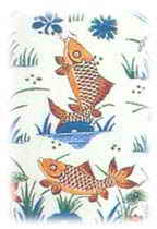 魚藻紋 “魚”與“余”同音,是“富貴有余”、“連年有余”的意思。魚紋幾乎是每個朝代都使用的主要裝飾圖案。魚紋種類繁多,如蓮池游魚,水波游魚,水藻游魚,或單或雙,或三、五追逐,魚水相融。雙數魚的構圖,在器壁用對稱法,兩兩相對;若在器心,則兩魚并排而游。三五尾單數魚的構圖,多是順向追逐游動,空間飾以浮萍、水草、蓮花之類花草。