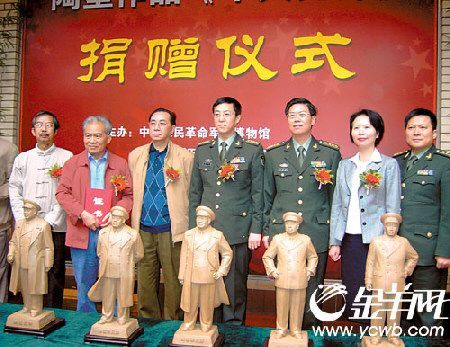 本報(bào)佛山訊 記者楊昱攝影報(bào)道:佛山五位國家級(jí)陶藝大師聯(lián)手創(chuàng)作的陶塑作品《十大元帥》將入京保存,本月19日,中國人民革命軍事博物館負(fù)責(zé)人接受了佛山新石灣美術(shù)陶瓷廠的捐贈(zèng)。據(jù)悉,這是該博物館第一次收藏石灣陶藝作品。
