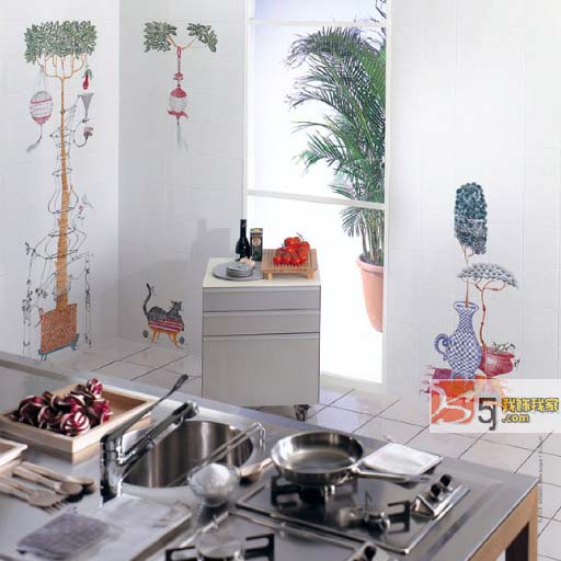 在這種色彩環(huán)境里,可以清爽為主導(dǎo)。鄉(xiāng)土氣息的顏色搭配讓人神清氣爽。相比于地面,墻面顯然有更大的發(fā)揮余地,因此是最好的表現(xiàn)場所。圖案是調(diào)制田園味道不可缺少的組成部分,精美圖案的組織安排,四方聯(lián)的整塊使用或二方聯(lián)的連續(xù)使用都會(huì)很容易被人接受。明亮的空間是讓空氣感到清新的重要因素,顏色含灰度不能高,要始終保持一定的亮度。而高明度的原木色或略含灰度的藍(lán)綠色在色彩感覺上比較對(duì)味,也更適合廚房。