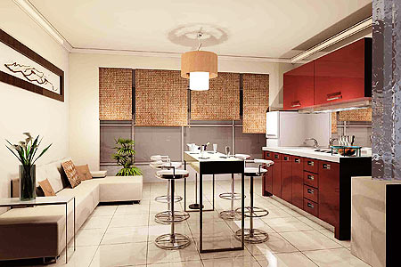 廚房的墻面必須以實(shí)用為主,但新型材料的出現(xiàn)為其裝飾功能奠定了基礎(chǔ)。在能解決油煙的前提下,你可以嘗試使用涂料和墻紙,它們色彩艷麗,花紋豐富,一改廚房墻壁單調(diào)的局面。這時選擇的涂料墻紙要有很好的耐擦洗性和多層覆蓋性。在水池和灶臺附近,可以用玻璃、金屬等合成材料制作的隔油層釘在墻上。