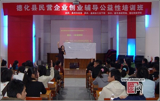 【德化網(wǎng) 訊】 為貫徹落實(shí)省委,省政府《關(guān)于全面提升民營(yíng)經(jīng)濟(jì)發(fā)展水平的若干意見》(閩委發(fā)〔2005〕9號(hào)文)及省經(jīng)貿(mào)、省財(cái)政廳《關(guān)于開展民營(yíng)企業(yè)創(chuàng)業(yè)培訓(xùn)工作的通知》(閩經(jīng)貿(mào)企業(yè)〔2005〕347號(hào)文)精神,泉州市經(jīng)濟(jì)委員會(huì)于2007年12月27日在德化陶瓷職業(yè)技術(shù)學(xué)院舉辦德化縣民營(yíng)企業(yè)創(chuàng)業(yè)輔導(dǎo)公益性培訓(xùn)班。培訓(xùn)班聘請(qǐng)陳安之國(guó)際機(jī)構(gòu)金牌講師、福建總監(jiān)、同創(chuàng)企業(yè)管理顧問公司執(zhí)行董事、首席講師鄭羽宏和華僑大學(xué)工商管理學(xué)院副院長(zhǎng)、工商管理研究所副所長(zhǎng)、營(yíng)銷競(jìng)爭(zhēng)力研究中心主任、中國(guó)市場(chǎng)協(xié)會(huì)理事、中國(guó)市場(chǎng)學(xué)會(huì)專家委員會(huì)委員曾路分另給學(xué)員作了《市場(chǎng)營(yíng)銷》和《企業(yè)策劃與品牌戰(zhàn)備》的專題講座。