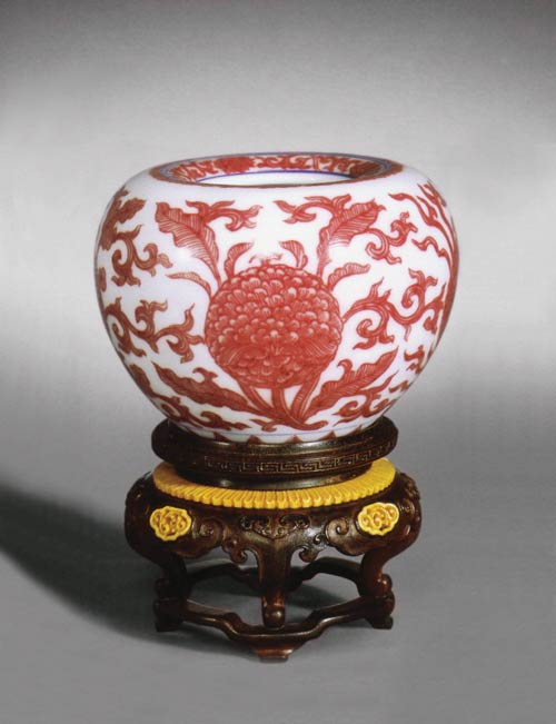 宣德釉里紅傳世極少,其胎體細(xì)膩,釉面潔白,再和明艷的釉里紅相配合,達(dá)到了釉里紅工藝極高的境界。而且還出現(xiàn)了以白釉鋪地剔花填紅釉的新技法,所填紅釉已經(jīng)略微高出白釉釉面,這是宣德釉里紅的一個(gè)特點(diǎn)。由于高溫銅紅釉燒成難度極大,后世仿品達(dá)到宣德釉里紅的水平,惟有清雍正一朝,而且創(chuàng)造性地?zé)瞥隽?ldquo;青花釉里紅”。
