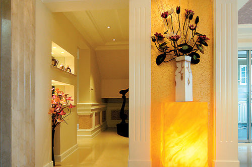 一層客廳是斜頂,因此,吊頂不做過多的裝飾,只是把客廳墻面設(shè)計為高護墻裙式樣,配以前后大理石背景墻,這樣就比較成功地實現(xiàn)了視線的下移,虛化處理了客廳頂面。