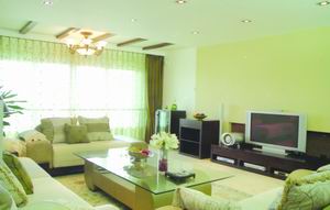 ■客廳 本案的設(shè)計(jì)使整個空間更加連貫、開闊?蛷d的天花板采用散點(diǎn)光源設(shè)計(jì),使燈光明亮而柔和。深色的胡桃木沙發(fā)背墻,配上現(xiàn)代感十足的電視音響,名貴而不張揚(yáng),極好地襯托出了整體風(fēng)格的沉靜與素雅。門廳作為客廳與餐廳的過渡空間,承接了客廳的厚重與餐廳的精致,精巧的配飾與裝飾畫,在燈光的映射下十分生動。