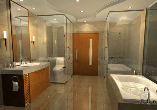 (4)墻面直用光潔素雅的瓷磚,頂棚宜用塑料板材、玻璃和半透明板材等吊板,亦可用防水涂料裝飾。