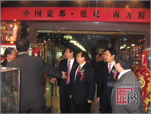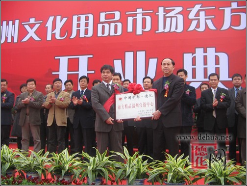 【德化網(wǎng) 訊】 12月28日,正當(dāng)溫州文化用品市場——東方工藝美術(shù)城開業(yè)典禮之際,中國瓷都 德化—南方精品浙江溫州營銷中心也于當(dāng)日在溫州東方工藝美術(shù)城正式授牌,開業(yè)迎賓。這是我縣精品陶瓷在溫州市的一次全面展示,也是德化與溫州兩地?cái)y手合作、攜手發(fā)展的一個(gè)良好的窗口。