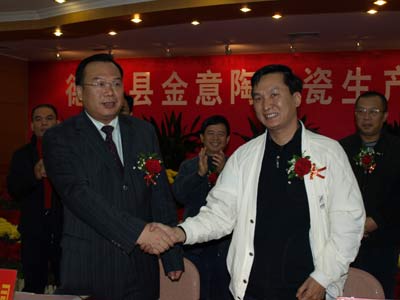 金意陶董事長兼總經(jīng)理何乾先生親率公司中高層人員60人赴德慶縣政府方面主辦的規(guī)格隆重的簽約儀式。在"節(jié)能減排"呼聲日益高漲的產(chǎn)業(yè)背景下,金意陶落戶廣東德慶事件被禪城區(qū)經(jīng)貿(mào)局副局長沈樹華同志喻為"靚女先嫁",因此簽約現(xiàn)場吸引了眾多新聞媒體到訪。