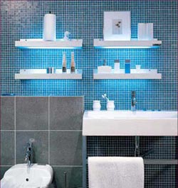 收納方式墻上的四個擱板既可以用來收納洗面、刷牙、漱口的用品,又可擺放裝飾畫,還放置了衛(wèi)生紙。位于陶瓷的水盆下面的擱架能用來搭放毛巾。墻面既裝飾又實用地鑲嵌了四個擱板,非常好地利用了空間,并且四個擱板下面分別安裝了綠槽掛燈。當燈光開啟,光束映襯在翡翠墻上,不僅可以反射照明,也讓墻面看上去更加漂亮,碧綠如翡翠。