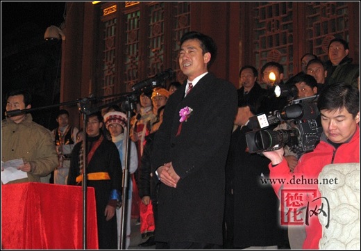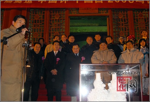 國家文物局局長單霽翔、北京市文物局局長孔繁峙、中國非物質(zhì)文化遺產(chǎn)保護中心副主任謝克林、中國通俗文藝研究會秘書長馮乃華、中國陶瓷工業(yè)協(xié)會秘書長黃芯紅、泉州市委常委、常務(wù)副市長廖小軍、縣長李輝躍、副縣長黃耀昆、曾憲堡、大鐘寺古鐘博物館館長解小敏、古鐘博物館書記吳志友、中國社會科學(xué)院研究員丁守璞及社會各界人士千余人出席了大典活動。廖小軍、李輝躍在大典儀式上發(fā)表了熱情洋溢的講話,代表泉州市和瓷都德化祝福北京2008奧運會圓滿成功,祝福北京市民幸福安康。