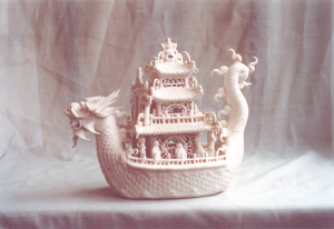 古人曾有“邢瓷類銀、越瓷類玉”和“邢瓷類雪、越瓷類冰”之說,反瓷與之相比有過之而無不及。它無釉彩,但潔白來自天然;它器型小而結(jié)構(gòu)復(fù)雜,但又疏朗有余不見窄。陶瓷史上以德化白瓷、石灣廣均以及景德鎮(zhèn)加彩瓷塑最著,清代雍正朝協(xié)理景德鎮(zhèn)窯務(wù)的六十四為著名的瓷雕家,瓷雕在乾隆期最盛行。嘉、道時王炳榮、陳國治是享譽國內(nèi)的雕瓷大師,反瓷瓷雕生產(chǎn)數(shù)量少,流行不及反瓷雕瓷量多。反瓷瓷雕龍舟雖然無款,但非構(gòu)思巧異、工藝通神的大師,工藝也絕難至此。