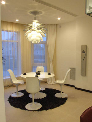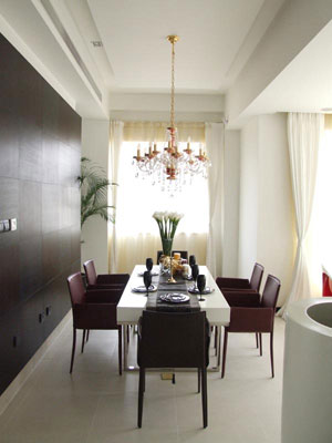25塊黑橡木掛墻板,將客廳與餐廳巧妙分割,餐廳空間整齊而不失富麗,黑與白搭配出一派純粹的傲慢與高貴?蛷d低矮的沙發(fā)茶幾,憑借橫平豎直的幾何體傳遞頓錯(cuò)有力的節(jié)奏感,淺色的腳踏和艷麗的配飾,凸現(xiàn)空間剛?cè)岵?jì)的別樣風(fēng)情。