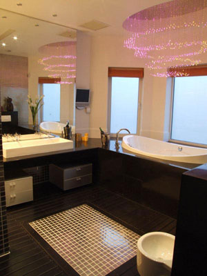 6.衛(wèi)浴空間大面積使用金屬馬賽克,和玻璃鏡面、貼花隔斷相得益彰,明快高調(diào)的表現(xiàn)將壓抑煩累一掃而空。