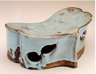 此件「天藍(lán)紫斑如意枕」,如意頭的塑形已略為簡化,加上天藍(lán)釉層夾雜月白流汁的特征,比較接近墓葬出土的元鈞釉色,故據(jù)以推測其窯燒年代應(yīng)為元朝。鈞窯經(jīng)多次施釉,釉層渾厚,飽含不同化學(xué)成分的釉,于燒造過程極易形成溶融交匯的情致,無論藍(lán)或紫,皆千變?nèi)f化,瑰麗多采,無跡可尋,一般以窯變釉相稱。觀察此枕,藍(lán)色釉面局部泛現(xiàn)的紫紅色斑塊,實系經(jīng)由人工涂繪銅料所致。