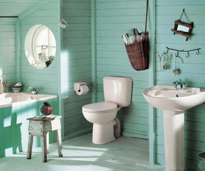 滿眼的湖綠色,如一泓春水,在陽光的照耀下熠熠生輝。乳白色的潔具、古樸自然的田園風(fēng)格浴室家具、一兩件藤木小物件,再沒有比這兒更閑適的地方了。
