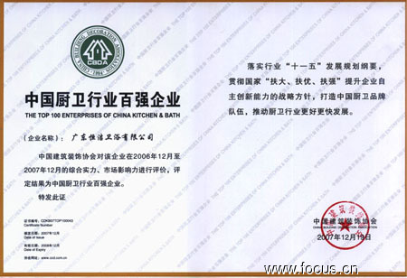 繼“政府強(qiáng)制采購節(jié)能產(chǎn)品”榮譽(yù),恒潔衛(wèi)浴捷報再傳。由中國建筑裝飾協(xié)會主辦的、以企業(yè)的綜合實力、市場影響力作為評價依據(jù),評定恒潔衛(wèi)浴與歐派櫥柜、方太廚具、科勒衛(wèi)浴、TOTO、惠達(dá)陶瓷等企業(yè)同步評為07年度《中國廚衛(wèi)行業(yè)百強(qiáng)企業(yè)》。此殊榮,充分肯定恒潔衛(wèi)浴這面民族品牌旗幟的不斷努力,極大的鼓舞恒潔人的士氣。相信在國家貫徹“扶大、扶優(yōu)、扶強(qiáng)”的戰(zhàn)略指導(dǎo)下,恒潔仍會一路領(lǐng)跑。