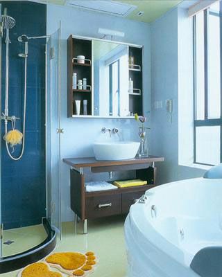 一般的普通住宅浴室,可安裝取暖、照明、排氣三合一的“浴霸”、普通的浴缸、坐便器、臺式洗面盆、冷熱沖洗器、浴簾、毛巾架、浴鏡等。地面、墻面貼瓷磚,頂部可采用塑料板或有機(jī)玻璃吊頂。面積小的浴室,應(yīng)注意合理利用有限的空間,淋浴器比浴缸顯得經(jīng)濟(jì)與方便,臉盆可采用托架式,墻體空間可利用來做些小壁櫥、鏡面箱等,用來放置些零星物品。墻上門后可安裝掛鉤,用于掛衣帽之類物品。