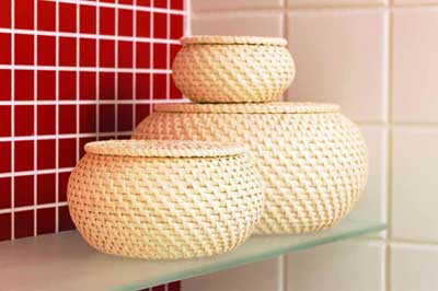 編織式收納罐,大有大的用途,小有小的道理;蛘呷繑[出來(lái),勾勒幅“吉祥三寶”的景象,讓爸爸、媽媽和孩子都收納有道。而且罐蓋能有效避塵,還具私密性,避免了來(lái)客用衛(wèi)浴間的不方便。手工編制,民俗特色,與衛(wèi)浴間的現(xiàn)代風(fēng)格形成對(duì)比,是現(xiàn)今流行的混搭派。