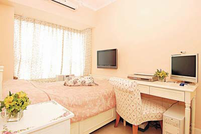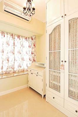 粉橙色布置可營造夢幻般的童話氣氛,教人頓時眼前一亮,營造“家”的感覺?、飯廳堂分界鮮明,墻身上半部配用粉橙色,甚為奪目,下半則以條紋式設(shè)計(jì),為平實(shí)的墻身增添動感一面?蛷d擺放了鮮紅色布藝沙發(fā),與一室散發(fā)的田園風(fēng)格甚為匹配。旁邊的落地玻璃配用半透視的碎花窗紗,可阻隔過量的日光內(nèi)進(jìn),又可為室內(nèi)空間添上鄉(xiāng)村風(fēng)味。細(xì)心一看,原來電視組合柜亦見心思,印上不少拼花圖案,為簡潔的柜子帶來生氣,輕易地點(diǎn)綴一室的視覺效果。維多利亞風(fēng)格飯廳布置精致,中央放了四人餐桌和碎花餐椅,為增添儲物量,已分別設(shè)計(jì)出同系列的飾柜及地柜,設(shè)計(jì)略帶維多利亞色彩,為單位塑造優(yōu)雅一面,亦營造了理想的進(jìn)膳環(huán)境。主人房貫用同一色系的家具,加設(shè)特色睡床背板,糅合房內(nèi)各式碎花圖案,讓房間恍如精品式小寢室,并放下小植物,為居者帶來好心情。另一方面,是一入墻躺式衣柜,以半透玻璃作配,內(nèi)藏間隔甚多,足以容納不少衣物。另一個房間則改為書房,淡淡的綠色設(shè)計(jì),感覺清新寫意,以深黑色吊燈作配。
