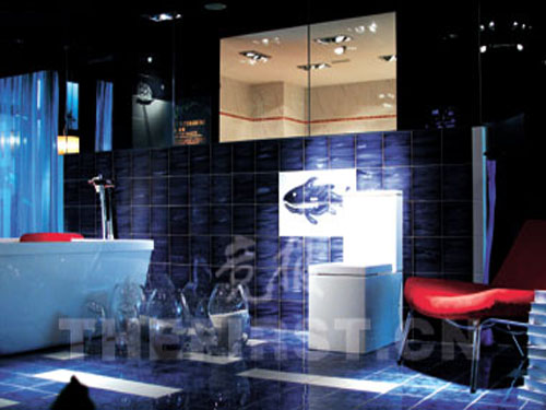 電梯升至意德法家三樓,首先映入眼簾的是一片藍色的海洋,帆船與鯨是意德法家整體衛(wèi)浴館最大的一間衛(wèi)浴樣板間,同時也是裝飾主義風格的代表、意大利藝術大師Marcello Chiarenza的作品。