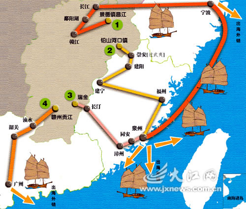 那么江西的瓷器產(chǎn)品外銷途徑是怎樣的?它是如何通過這四大港口外銷的呢?
