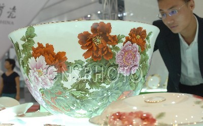 9月16日,一名男子第十屆唐山中國陶瓷博覽會上,觀看唐山海格雷骨制瓷有限公司精心制作的25寸精美骨瓷超薄巨碗,該碗價格在6萬元人民幣之上。本屆唐山陶博會共有267家企業(yè)和個人參展,其中唐山企業(yè)等116家。“中國北方瓷都”唐山產(chǎn)瓷的歷史可以追溯到公元1403年的明朝永樂年?