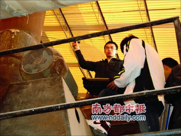 檢查人員在抽檢企業(yè)的二氧化硫排放是否達(dá)標(biāo)。記者湯克琴攝