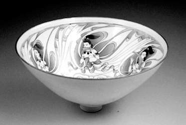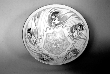這件東方飛天斗笠碗是她以敦煌飛天為母題,設(shè)計創(chuàng)作的具有中國傳統(tǒng)文化特征和當代藝術(shù)精神的佳作,這碗表達了她對半個多世紀來魂牽夢縈的敦煌的愛和對即將舉行的北京奧運的無限深情和祝福。