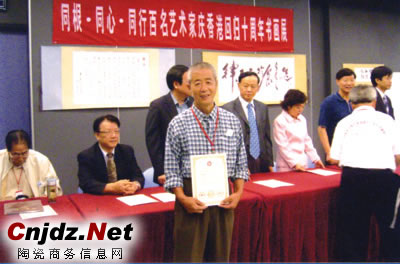 近日,河北省邯鄲市峰峰礦區(qū)陶瓷大師閆保山攜女兒閆英(陶瓷一級(jí)藝術(shù)家)應(yīng)邀參加了由中國(guó)文化名家協(xié)會(huì)、中國(guó)國(guó)際友好交流促進(jìn)會(huì)、中國(guó)海峽兩岸文化經(jīng)濟(jì)促進(jìn)會(huì)共同舉辦的“同根、同心、同行”百名藝術(shù)家慶香港回歸十周年書畫展,該展會(huì)在香港上環(huán)文藝中心召開,全國(guó)各。ㄊ校┌倜麜嫾壹爸T多書畫有業(yè)績(jī)者蒞臨大會(huì)。會(huì)上,閆保山和女兒閆英被授予“中港文化使者”榮譽(yù)稱號(hào)。所展作品會(huì)上經(jīng)權(quán)威專家認(rèn)真篩選評(píng)審,閆大師書畫作品《磁州窯圖案》獲金獎(jiǎng),為省、市爭(zhēng)得了榮譽(yù)。