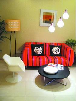 [會客區(qū)]這里的每一樣家具和擺設都是家具店里最常見的,可是,當他們安靜的靠在一起,就成了這首曲子最完美的部分。紅赫條紋布藝沙發(fā)帶有女人的嬌艷和男人的內斂,張揚中舒緩著沉穩(wěn)。永恒的黑白配似乎也成了線譜上的音符,白的擔任靠椅,黑的圓形小茶幾,視覺對比的沖撞中帶出了旋律般的美感。在固有在美麗中,是沙發(fā)后探出頭來的綠意賦予了樂曲生命,生活的氣息,就在這不經意的目光所及中彌漫。