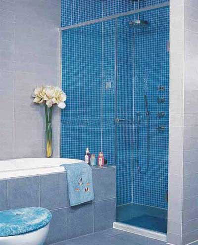 “整體浴房”的透明玻璃墻體與藍色馬賽克的組合,使空間顯得開闊,質(zhì)感搭配更和諧。