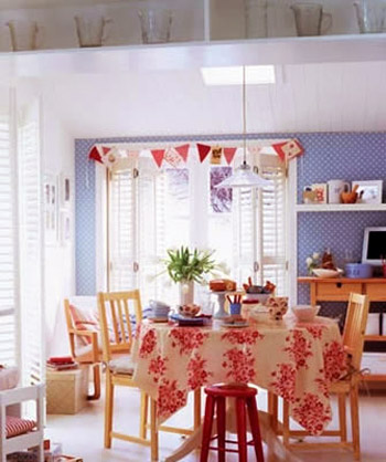 鮮明的白色、紅色和藍(lán)色將餐廳空間裝點(diǎn)得明凈、通透而又輕松寫(xiě)意。新英格蘭風(fēng)格的百葉窗門(mén)、圓點(diǎn)花樣的藍(lán)色壁紙和精制的白、紅色織物, 讓人輕易便歡快輕松起來(lái),那一排孩童的卡片更是讓家庭的溫暖瞬時(shí)散發(fā)出來(lái),令人陶醉。