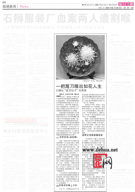 這座花籃出自德化城關寶山路的寶源瓷研所。與眾不同的是,瓷研所所長是位女性,名字叫鄭燕婷。她從事20多年的瓷花藝術堪稱一絕,不但創(chuàng)作出許多精美絕倫的瓷花、培養(yǎng)帶領出一大批優(yōu)秀的瓷花雕刻人才,還被德化瓷界譽為“瓷花仙子”。其創(chuàng)作的“百花爭艷”在“2007年中國收藏家喜愛的藝術大師和精品評選活動”中,被評為金獎;同時被評為“2007年度中國收藏家喜愛的陶瓷藝術大師”。