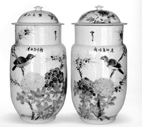 晚清時(shí)期釉上花鳥彩瓷有很多為摹古作品。多仿元人、八大山人、新羅山人等的繪畫風(fēng)格。這與清朝繪畫倡導(dǎo)摹古有很大的關(guān)系。但在追求古人筆墨的同時(shí)又受到“海派”或淺絳畫的影響,有所創(chuàng)新,從而形成自己的繪畫特點(diǎn)。此外,淺絳彩瓷畫也是在追求中國(guó)畫的創(chuàng)作精髓的基礎(chǔ)上產(chǎn)生的,所以也被看成為“摹古風(fēng)”的表現(xiàn)。