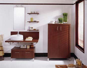 現(xiàn)代時尚的浴室家具款式大方、線條流暢利落、造型講究。在材質(zhì)上基本上以實木、玻璃甚至皮革為主,或是以橡木、楓木等實木經(jīng)過防潮處理,保持其天然木材的紋理與質(zhì)感;或是以鋼化玻璃為主,加以艷麗濃重的色彩,保持其晶瑩剔透、時尚的味道;或是以玻璃的面板、皮革與木制的柜體,高貴典雅不乏現(xiàn)代氣息。時尚的浴室柜體大多以掛式為主,下部懸空,一則保持了空間的通透感,二則實用方便清潔。